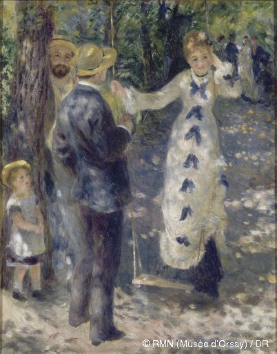 Un hombre de espaldas se dirige a una joven en pié en un columpio, bajo la mirada de una niña y de otro hombre apoyado encima del tronco de un árbol. Renoir nos da la impresión de sorprender una conversación: fija, como en un instantáneo fotográfico, el juego de las miradas que convergen hacia el hombre de espaldas. La joven desvía la mirada, como molesta. A este cuarteto del primer plano, responde el grupo de los cinco personajes en el fondo, que Renoir ha bosquejado rápidamente con unas cuantas pinceladas.